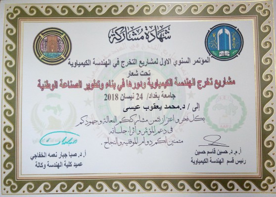 كلية الهندسة الخوارزمي تشارك بالمؤتمر الأول لمشاريع الهندسة الكيميائية في جامعة بغداد