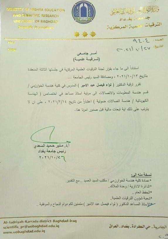 تتقدم عمادة كلية الهندسة الخوارزمي والأسرة التعليمية بأسمى آيات التهاني والتبريكات الى م.د.لواء فيصل عبد الامير التدريسي في قسم هندسة المعلومات والاتصالات بمناسبة الترقية إلى مرتبة أستاذ مساعد في اختصاص (الهندسة الكهربائية/ هندسة أتصالات ضوئية )