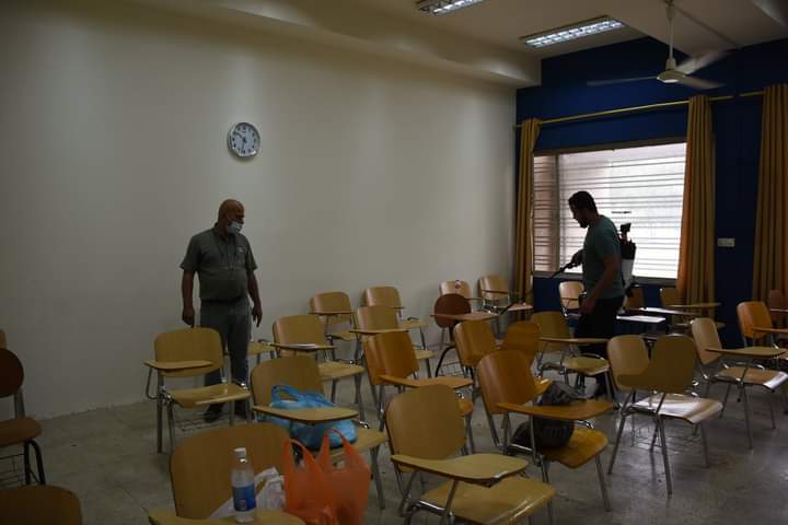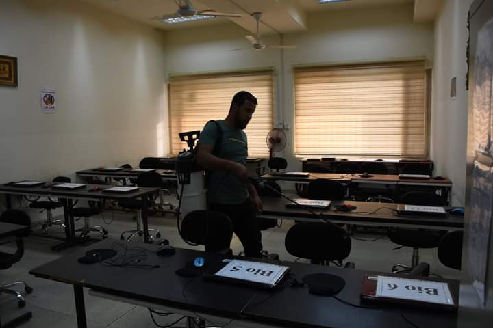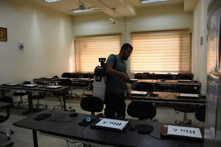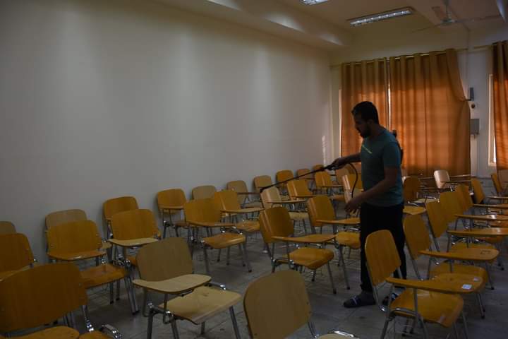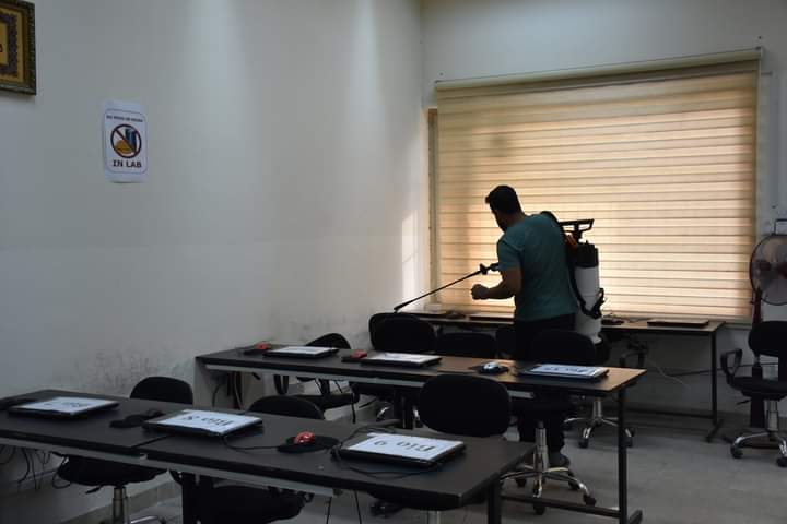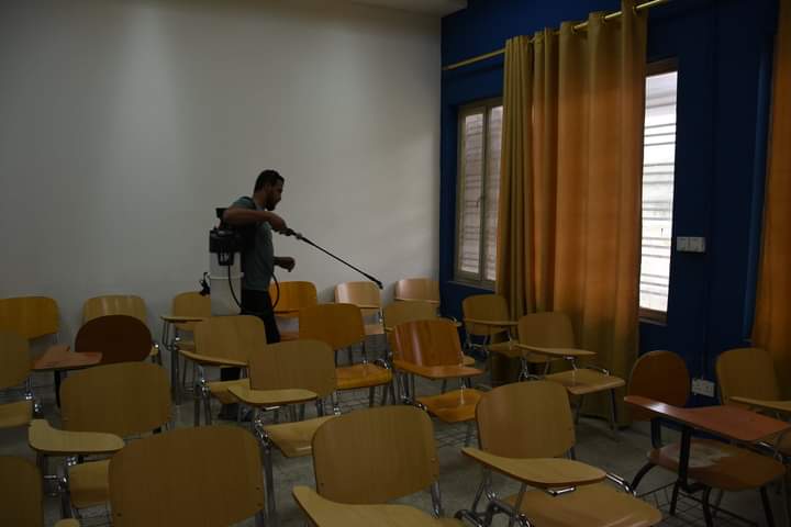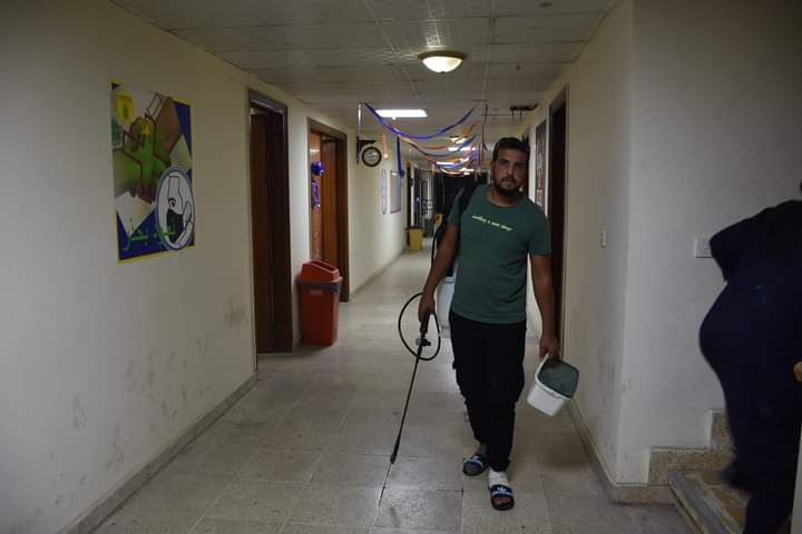 نظمت عمادة كلية الهندسة الخوارزمي حملة لتعفير بناية الاقسام العلمية والقاعات الدراسية والمختبرات العلمية للوقاية من خطر كورونا وذلك منذ بداية العام الدراسي والدوام الحضوري وتواجد الطلبة تضمنت حملات متواصلة ودورية لتعفير اروقة الكلية والقاعات الدراسية حفاظا على سلامة منتسبي الكلية من الملاكات التدريسية والطلبة وكانت الحملة واعمال التعفير بأشراف مدير وحدة الخدمات في الكلية م.م. علي حاوي وتوثيق عدسة أعلام الكلية .