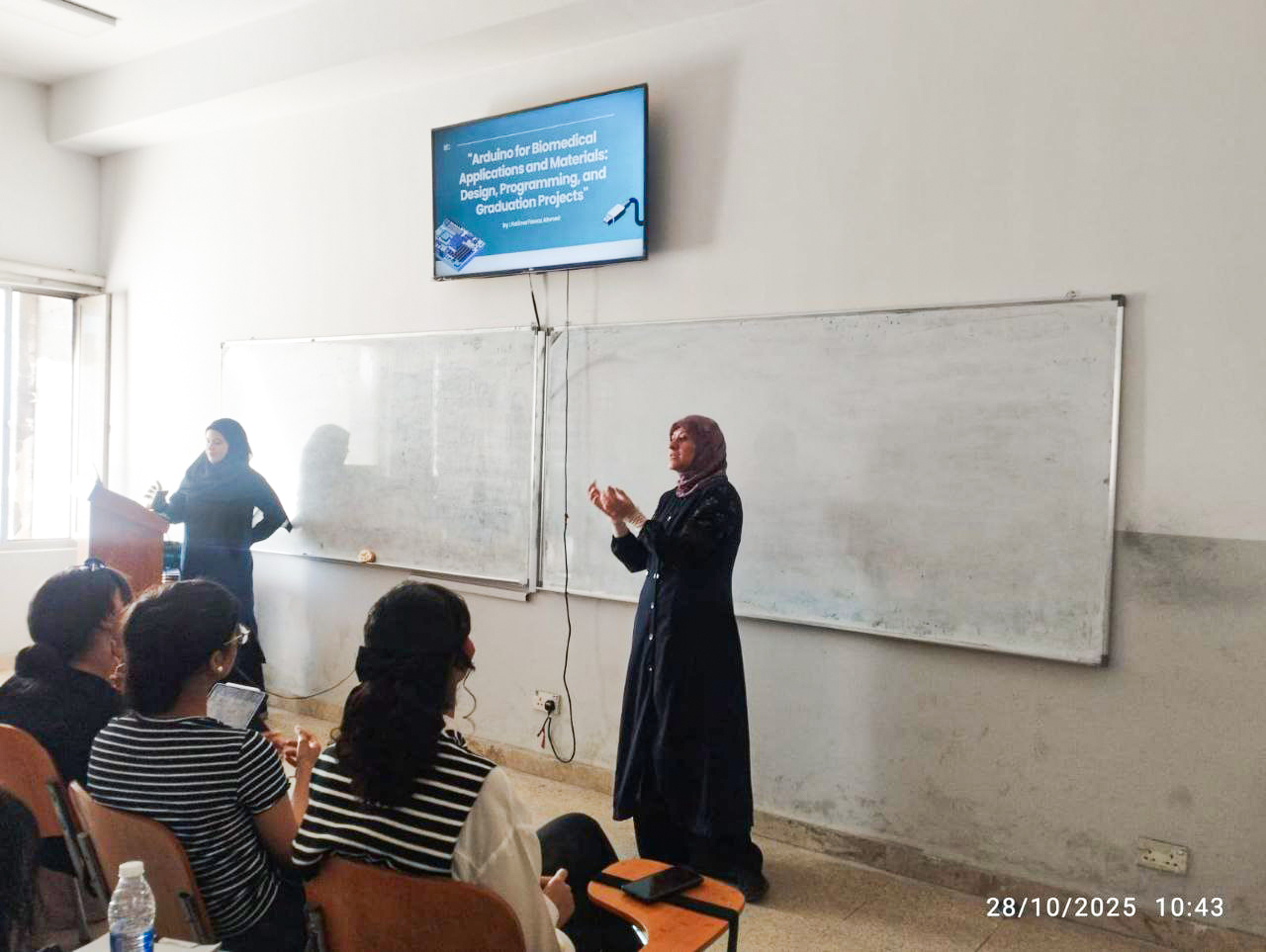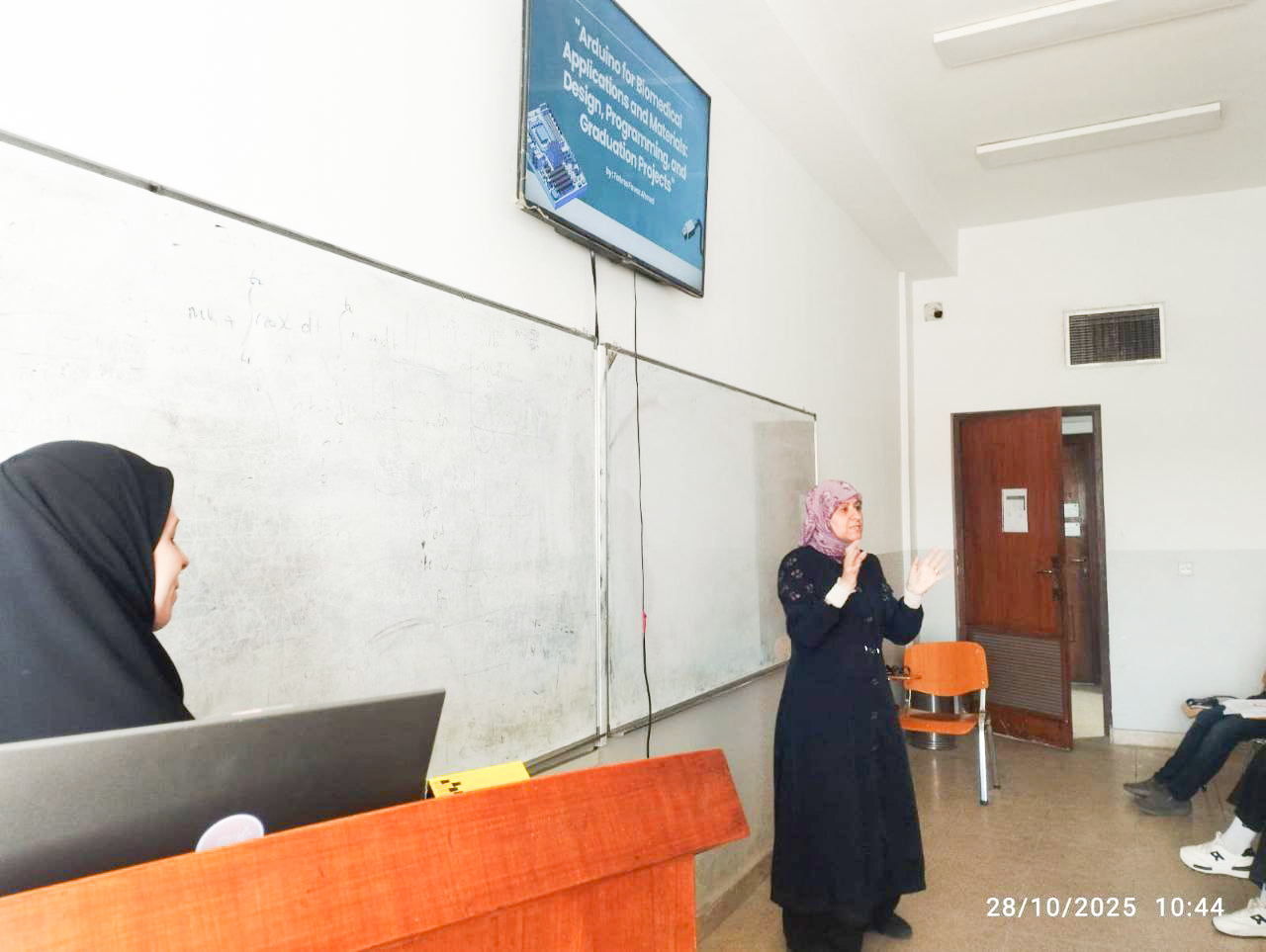 قدّمت الدورة كلٌّ من م. رباب علاء حميد ود. هاجر محمد علي كاظم، وهدفت إلى تمكين الطلبة من استخدام منصة Arduino في تصميم وتطوير التطبيقات الهندسية والطبية الحيوية، من خلال تعلم أساسيات البرمجة والتعامل مع المستشعرات والأنظمة الإلكترونية، والتعرف على المواد المستخدمة في التطبيقات الطبية، إضافةً إلى تطوير مهارات الطلبة في تصميم وتنفيذ مشاريع التخرج التي تجمع بين التقنيات الإلكترونية والاحتياجات الطبية العملية.